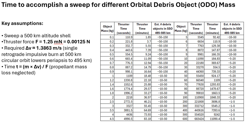 Each OrbitSweeper requires two thrusters: one for momentum transfer to the debris and one for station-keeping.